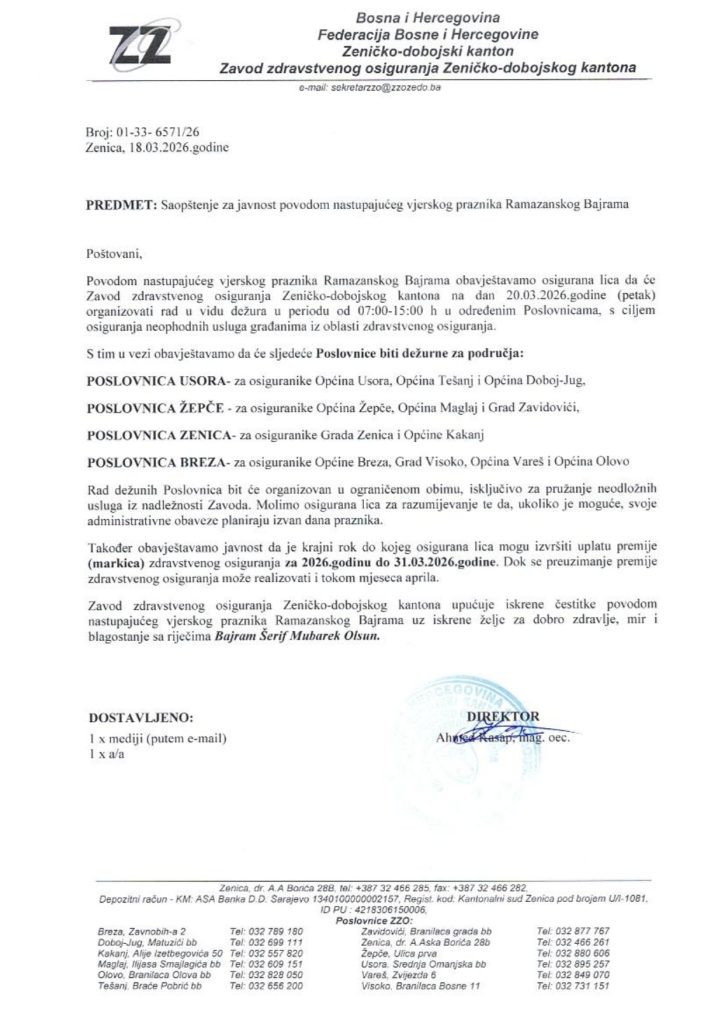 Povodom nastupajućeg vjerskog praznika Ramazanskog Bajrama obavještavamo osigurana lica da će Zavod zdravstvenog osiguranja Zeničko-dobojskog kantona na dan 20.03.2026.godine (petak) organizovati rad u vidu dežura u periodu od 07:00-15:00 h u određenim Poslovnicama, s ciljem osiguranja neophodnih usluga građanima iz oblasti zdravstvenog osiguranja.