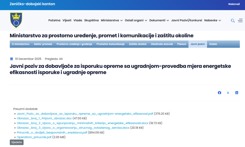 Tekst Javnog poziva, obrasci i prateća dokumentacija dostupni su na web-stranici Vlade Zeničko-dobojskog kantona: https://shorturl.at/45iFQ