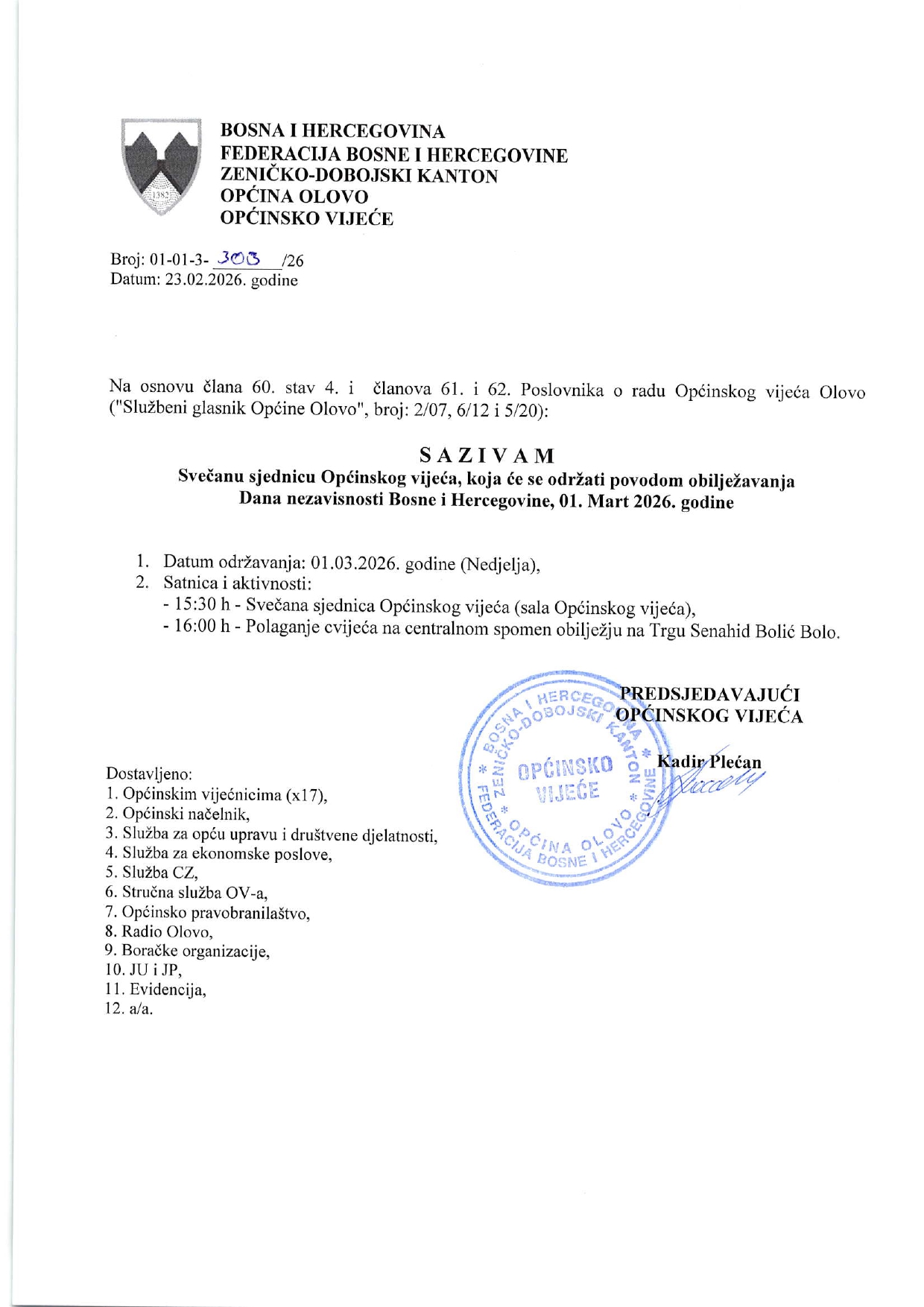 U povodu 1.marta Dana nezavisnosti Bosne i Hercegovine Općinsko vijeće Olovo održat će Svečanu sjednicu u nedjelju 1.marta 2026.godine u sali OV Olovo sa početkom u 15:30 sati.